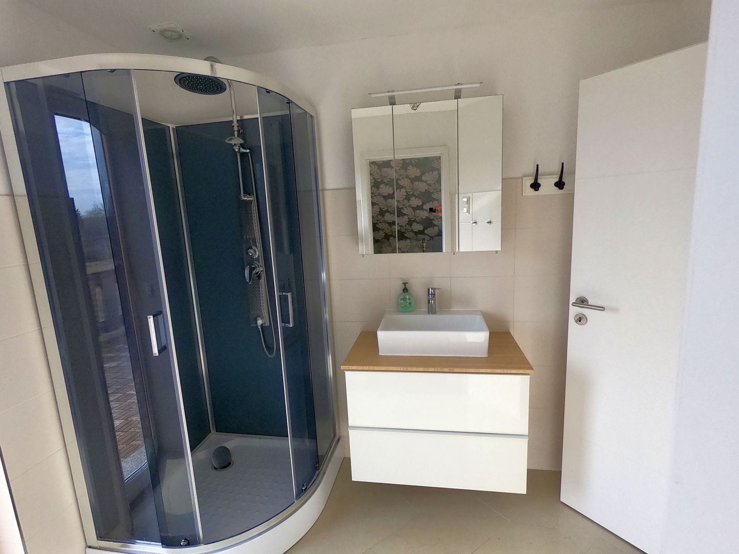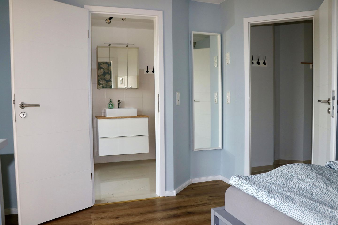 Im Obergeschoss befinden sich die beiden Schlafzimmer: Eines der Schlafzimmer verfügt über ein 1,60 m breites Doppelbett (durchgehende Matratze), Kommode und den Austritt auf den Balkon mit traumhaftem Seeblick. Das andere Schlafzimmer ist ebenfalls mit einem 1,60 m breiten Doppelbett (einzelne Matratzen) und einer Kommode ausgestattet. Beide Schlafzimmer verfügen jeweils über ein eigenes Badezimmer mit Dusche, separatem WC, Waschbecken, Handtuchheizkörper und Fenster. Ein Föhn ist auch vorhanden.