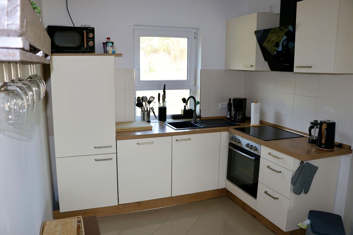 Die ca. 85 qm große Doppelhaushälfte bietet im Erdgeschoss einen großzügigen Wohn- und Essbereich mit tollem Blick auf den Groß Labenzer See. Sie finden hier ein ausziehbares L-Sofa (auf Anfrage sind so auch eine 5. und 6. Person willkommen), TV, Essplatz und die sehr gut ausgestattete Küche, die u.a. über Herd, Backofen, Spülmaschine, Kühlschrank mit separatem Gefrierschrank, Mikrowelle, Wasserkocher, Toaster, Kaffeemaschine und French Press verfügt. Ebenfalls im Erdgeschoss befindet sich noch ein kleines Gäste-WC. Die Terrasse ist möbliert und durch den darüber liegenden Balkon überdacht, ein Holzkohlegrill ist auch vorhanden.