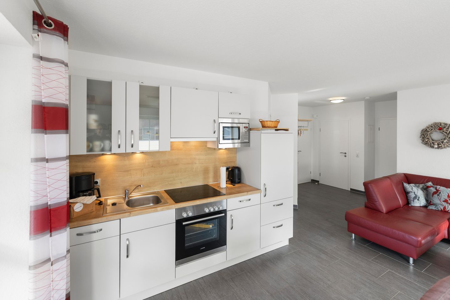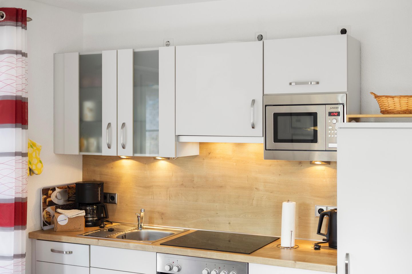 Die moderne Küche ist ausgestattet mit Geschirrspülmaschine, Ceran-Kochfeld, Backofen, Mikrowelle, Kühlschrank mit Gefrierfach, Kaffeemaschine, Wasserkocher, Eierkocher, Toaster u.v.m.