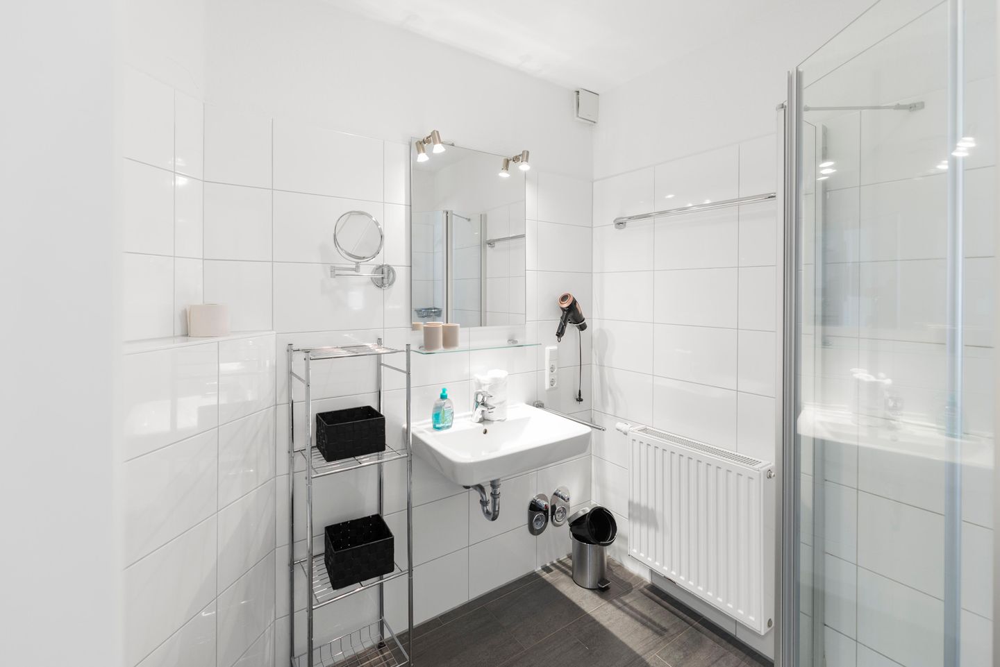 Das Badezimmer verfügt über Waschbecken, Toilette, ebenerdiger Dusche mit Glasabtrennung und Fön.