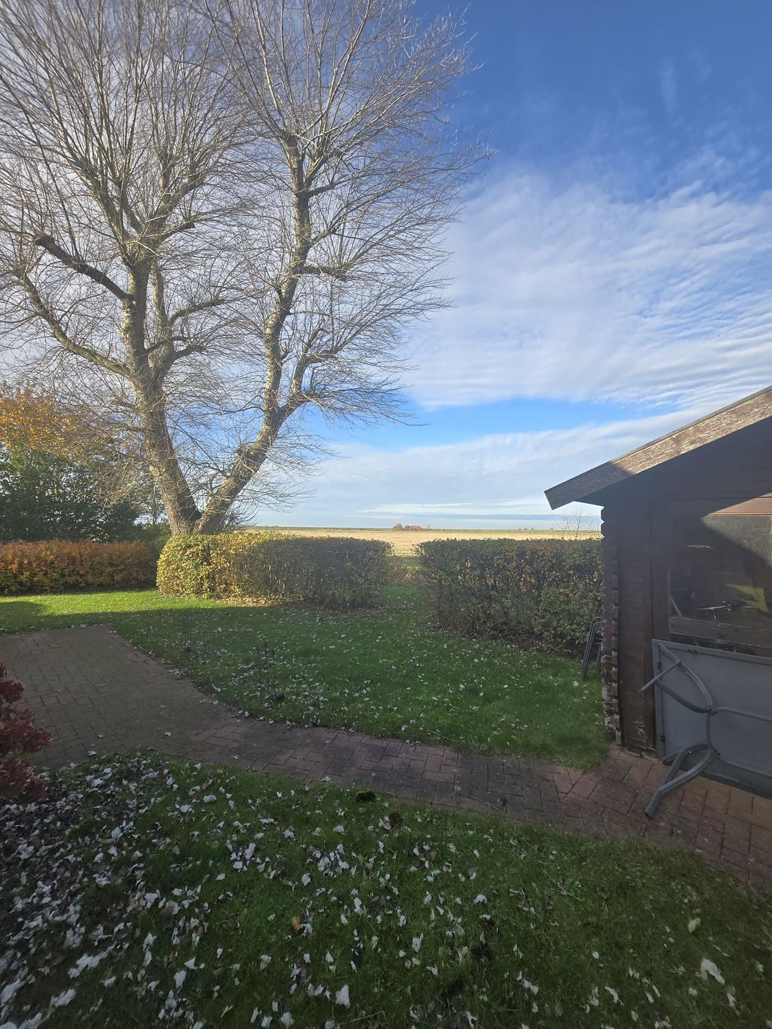 Von der Terrasse aus haben Sie freien Blick über die Wiesen und Felder bis hin zum Deich.