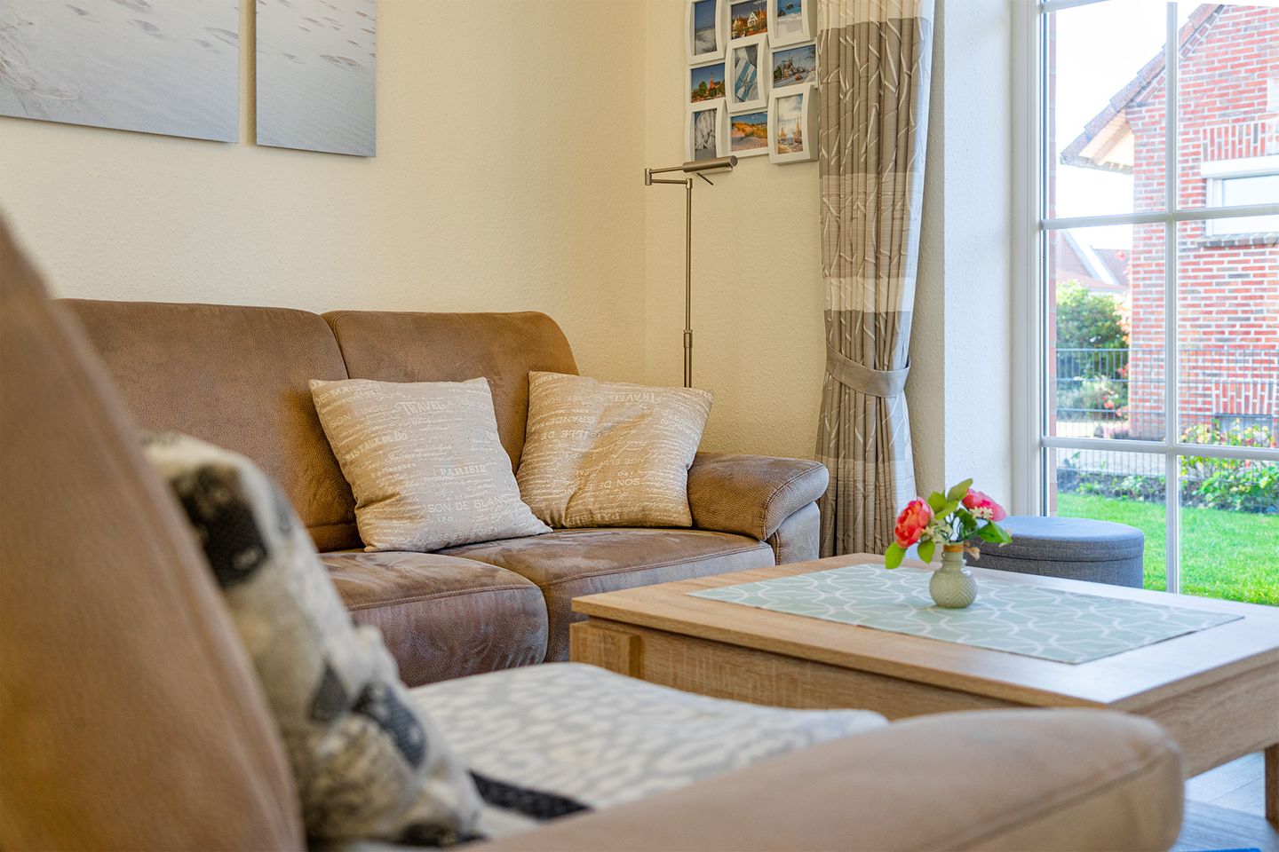 Der großzügige Wohn-Essbereich mit schönem Erker (mit Sichtschutz-Plissees und Vorhänge) lässt keine Wünsche offen: Die hochwertige Küche verfügt über Backofen, Mikrowelle, Kühl-/Gefrierkombination, Geschirrspülmaschine, Kaffeemaschine + Senseo, Eierkocher, Wasserkocher, Toaster, Mixer, u.v.m. Für Gäste, die die ostfriesische Gemütlichkeit mit einer Tasse Tee genießen möchten, steht ein komplettes Teeservice bereit.