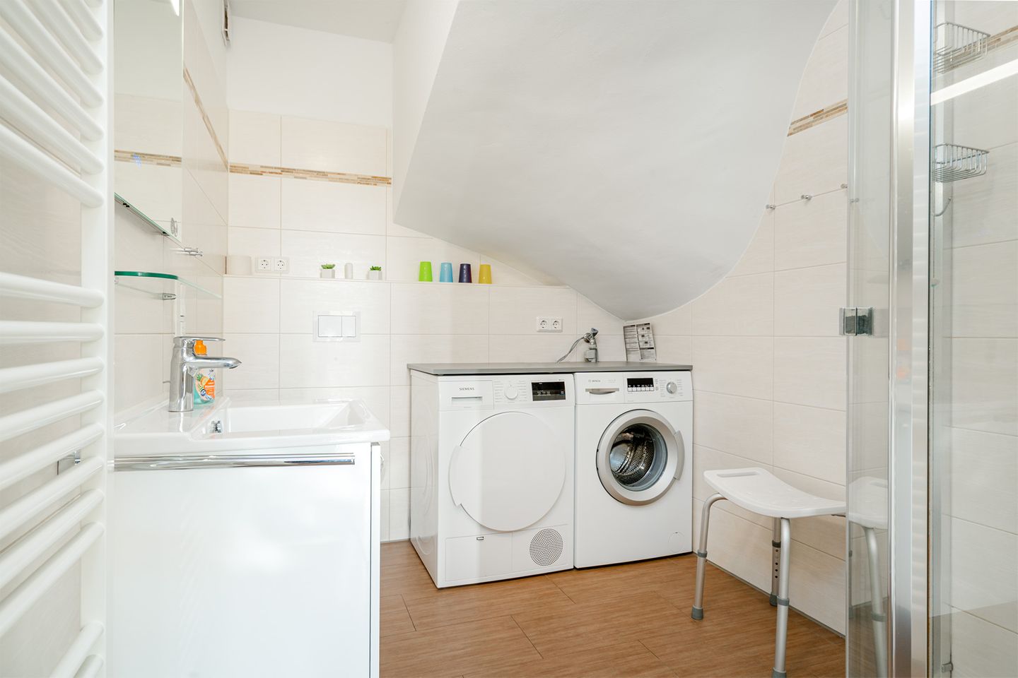 Ein schönes komfortables Bad (Dusche mit flachem Einstieg) mit Handtuchheizkörper und Fön sorgt für Ihr Wohlbefinden. Praktisch ist das zusätzl. Gäste-WC. Waschmaschine, Trockner, Wäscheständer, Bügeleisen und -brett sind ebenfalls vorhanden.