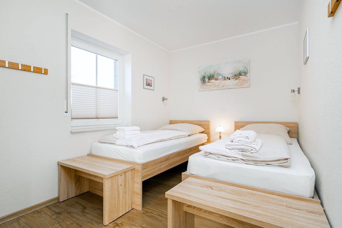 Es gibt 2 Schlafräume (1 x Doppelbett + 2 x Einzelbetten) mit Kleiderschrank und weiteren TV.