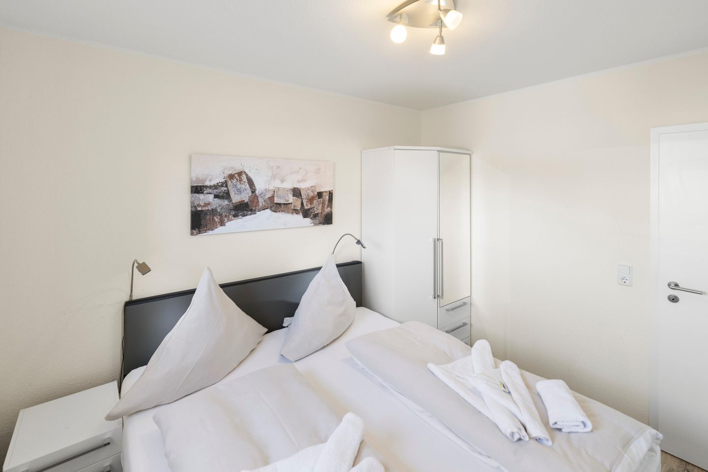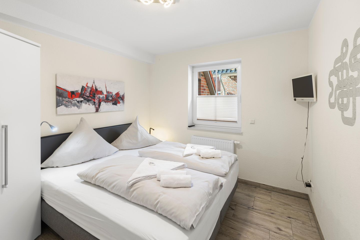 Beide Schlafzimmer sind mit einem Mustering-Boxspring-Doppelbett ausgestattet. In einem Schlafzimmer befindet sich ein weiterer Fernseher. Die Schlafräume sind mit Außenrollos und Fliegengitter versehen.