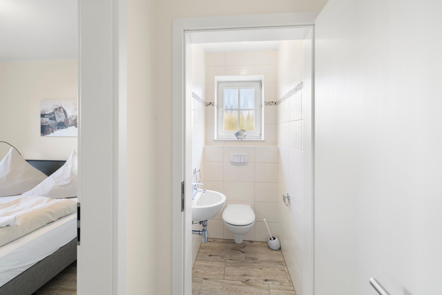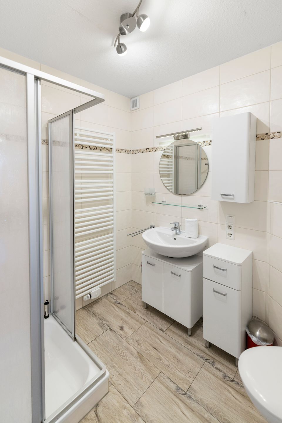 Zusätzlich zum Duschbad mit WC, Handtuchheizkörper und Föhn gibt es ein Gäste-WC.
