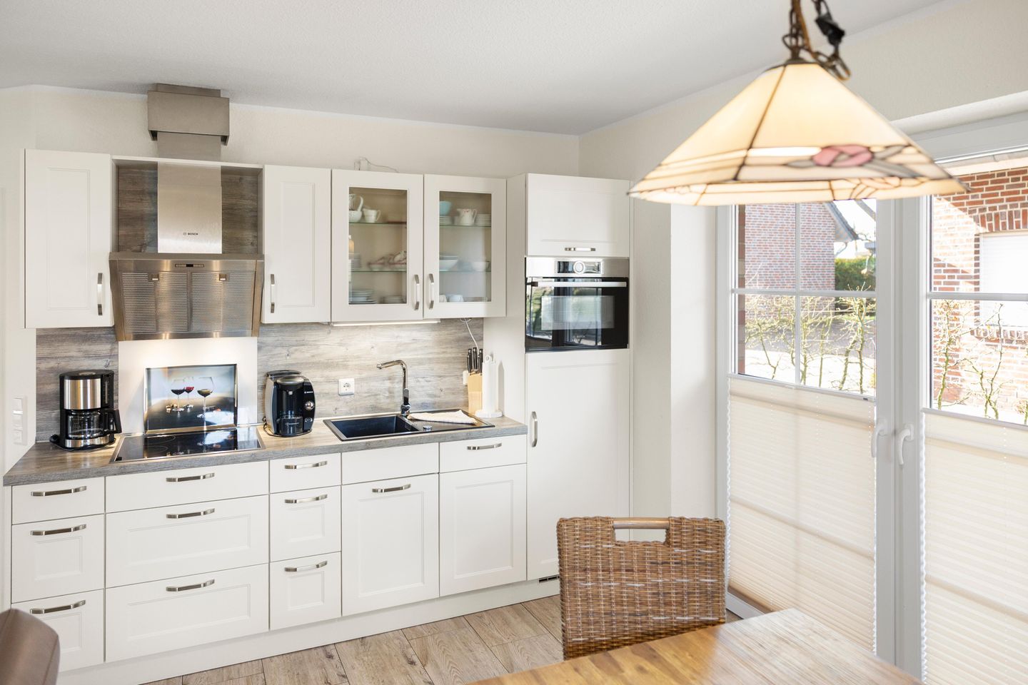 Die hochwertige Küche ist reichhaltig ausgestattet: Geschirr, Töpfe, Besteck, Tassimo-Kaffeemaschine, Stabmixer, Wasserkocher, Toaster, Spülmaschine, Mikrowelle, Backofen, Kühlschrank (kein Gefrierfach)