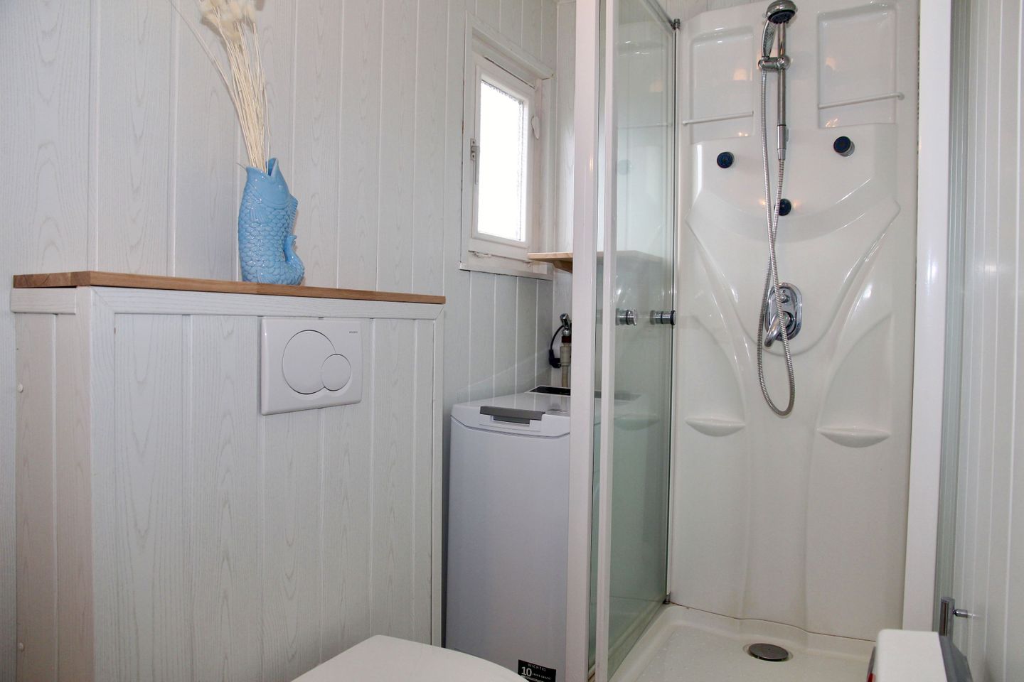 Das Badezimmer verfügt über WC, Dusche, Waschbecken, Fenster, Föhn und eine Toploader-Waschmaschine.
