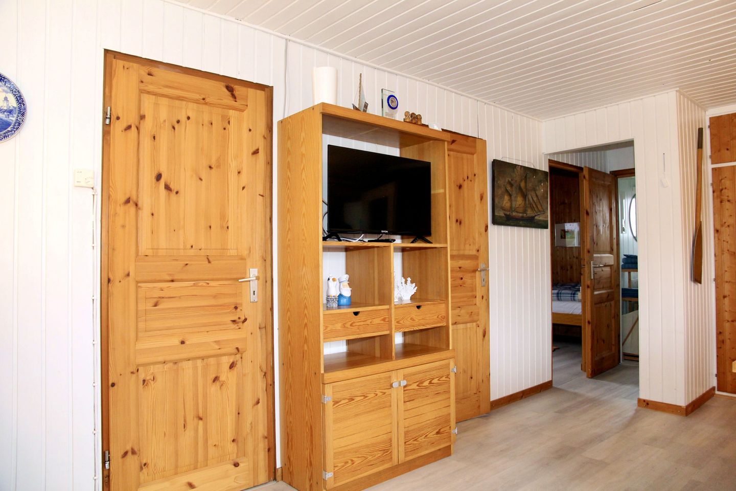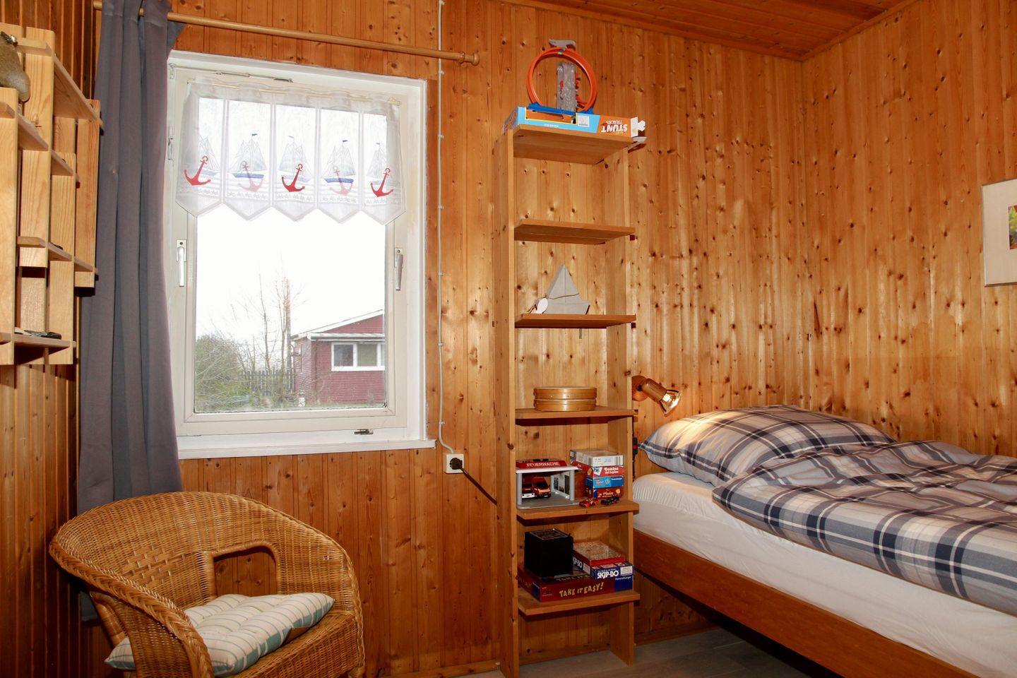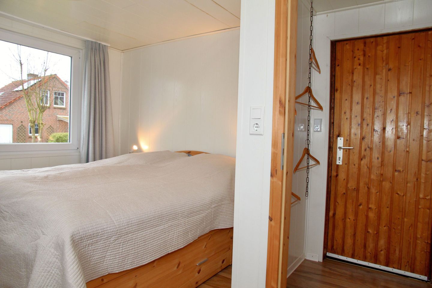 Sie betreten das Ferienhaus über die große und teilweise überdachte Terrasse mit neuer Möblierung und schönem Blick in den Garten und die umliegenden Kanäle. Im Haus finden Sie abgehend vom kleinen Eingangsbereich mit Garderobe das Elternschlafzimmer im Anbau mit Doppelbett (1,60 m x 2,00 m, einzelne Matratzen), Kleiderschrank und TV.