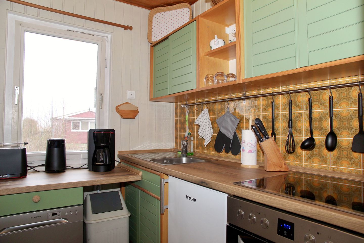Die Küche ist u.a. mit Kühlschrank, kleiner Spülmaschine, Herd, Backofen, Toaster, Wasserkocher, Kaffeemaschine und Senseo-Padmaschine ausgestattet, einen separaten Gefrierschrank finden Sie im Abstellraum außen am Haus.