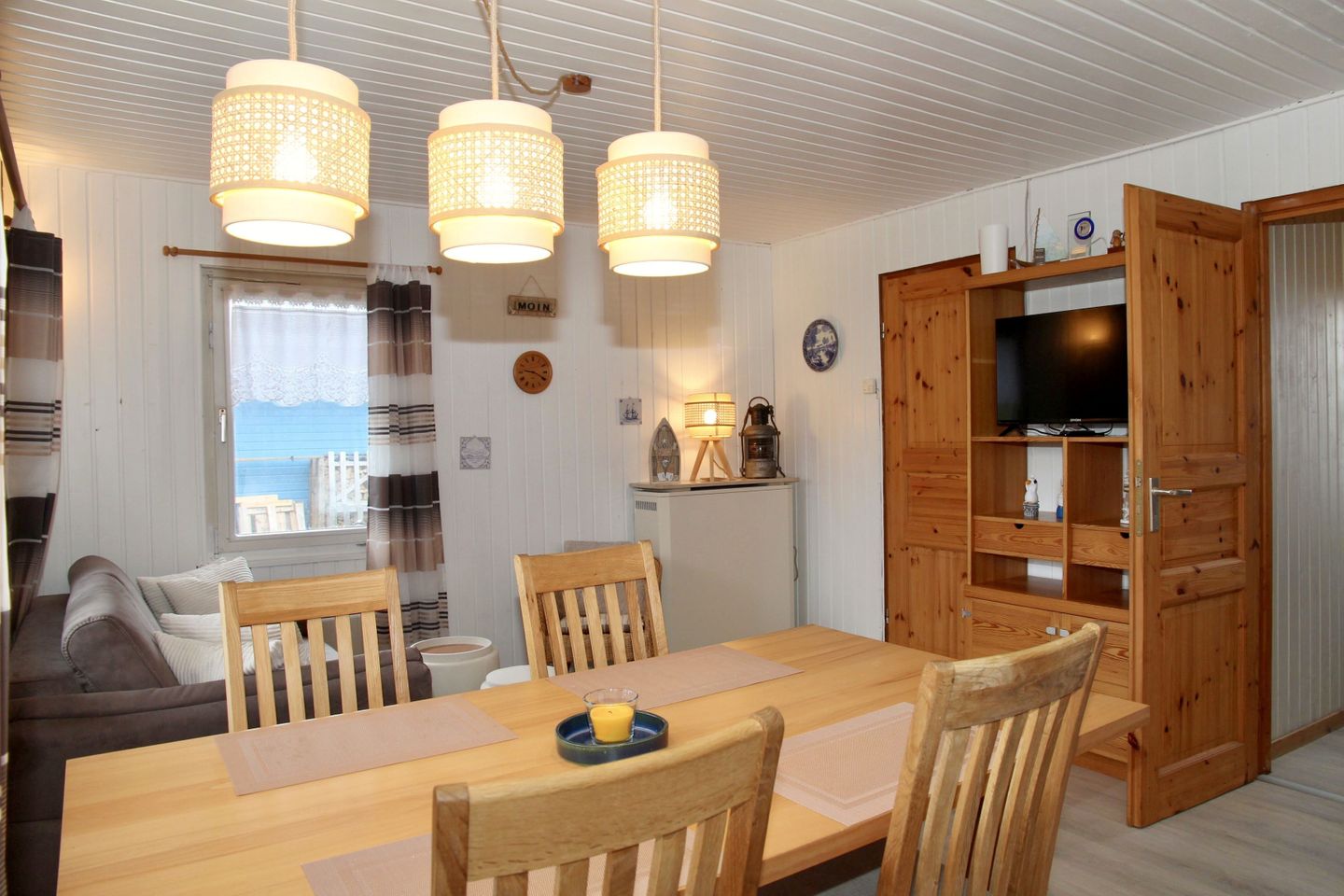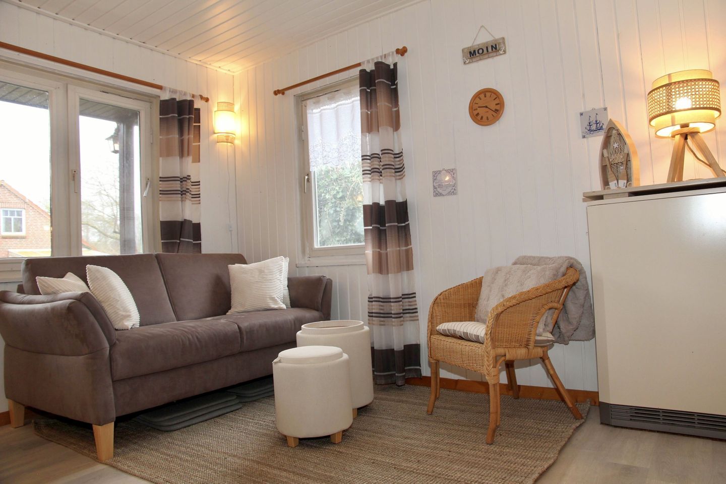 Im Haupthaus gelangen Sie in den Wohn- und Essbereich mit Sofa, Sessel, TV, Essplatz und einigen Einbauschränken mit ausreichend Verstaumöglichkeiten.