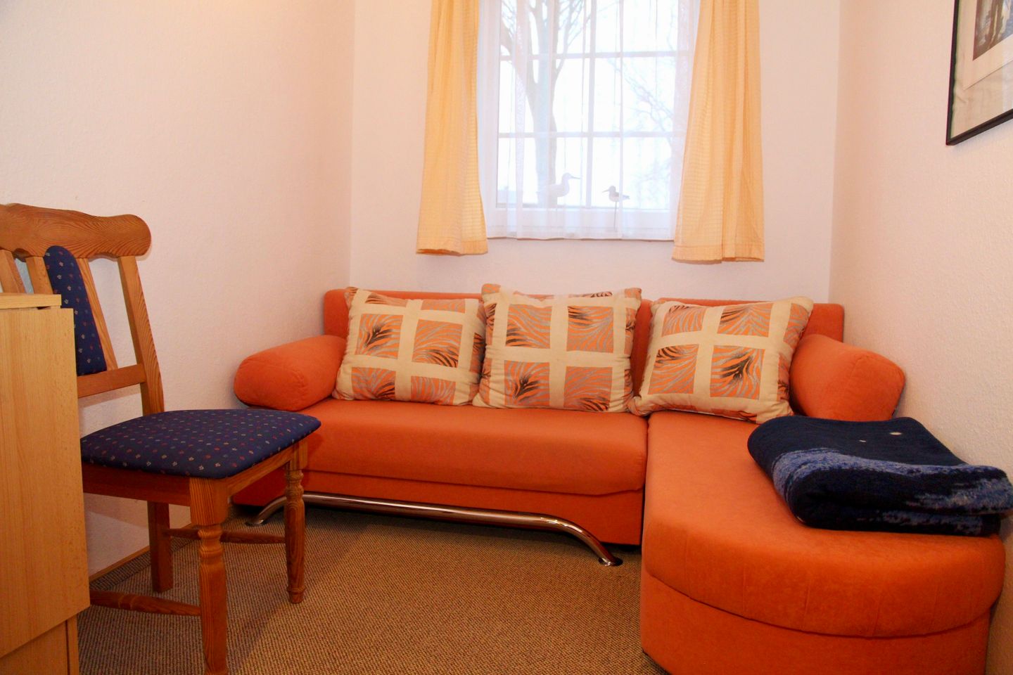 Ebenfalls im Erdgeschoss befindet sich ein Schlafzimmer mit Doppelbett (einzelne Matratzen) und Kleiderschrank, ein Zimmer mit einem Schlafsofa für eine weitere Person, ein Badezimmer mit Dusche, WC, Waschbecken und Fön, sowie der Abstellraum mit Waschtrockner, Wäscheständer, Bügeleisen und -brett.