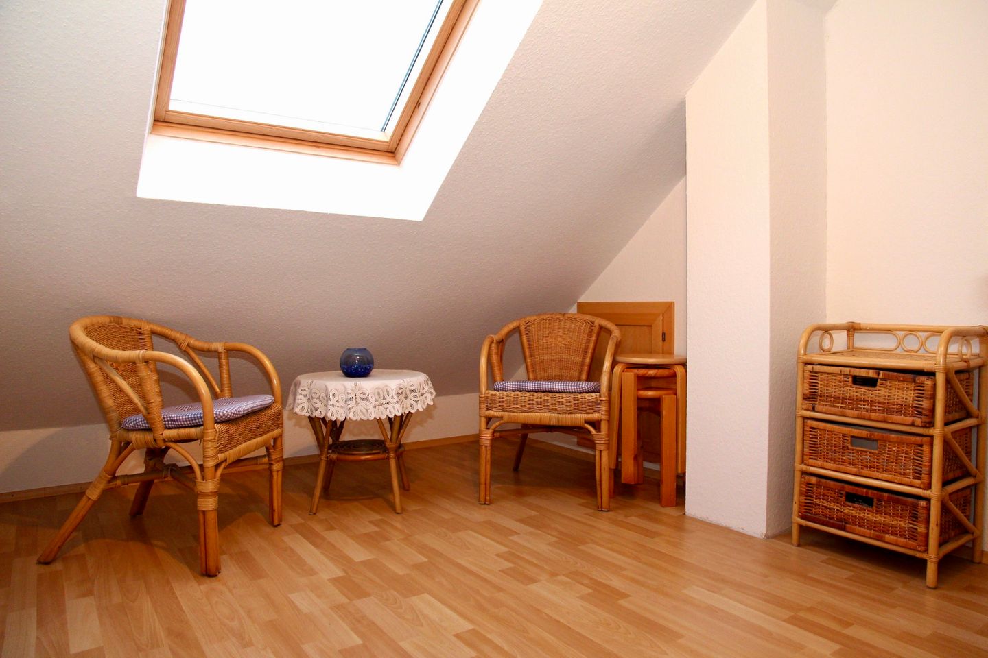 Alle Schlafräume sind mit Verdunklungsvorhängen versehen, im Obergeschoss liegt Laminat, im Erdgeschoss befinden sich Fliesen, nur die beiden Schlafräume im EG verfügen über Teppichboden.